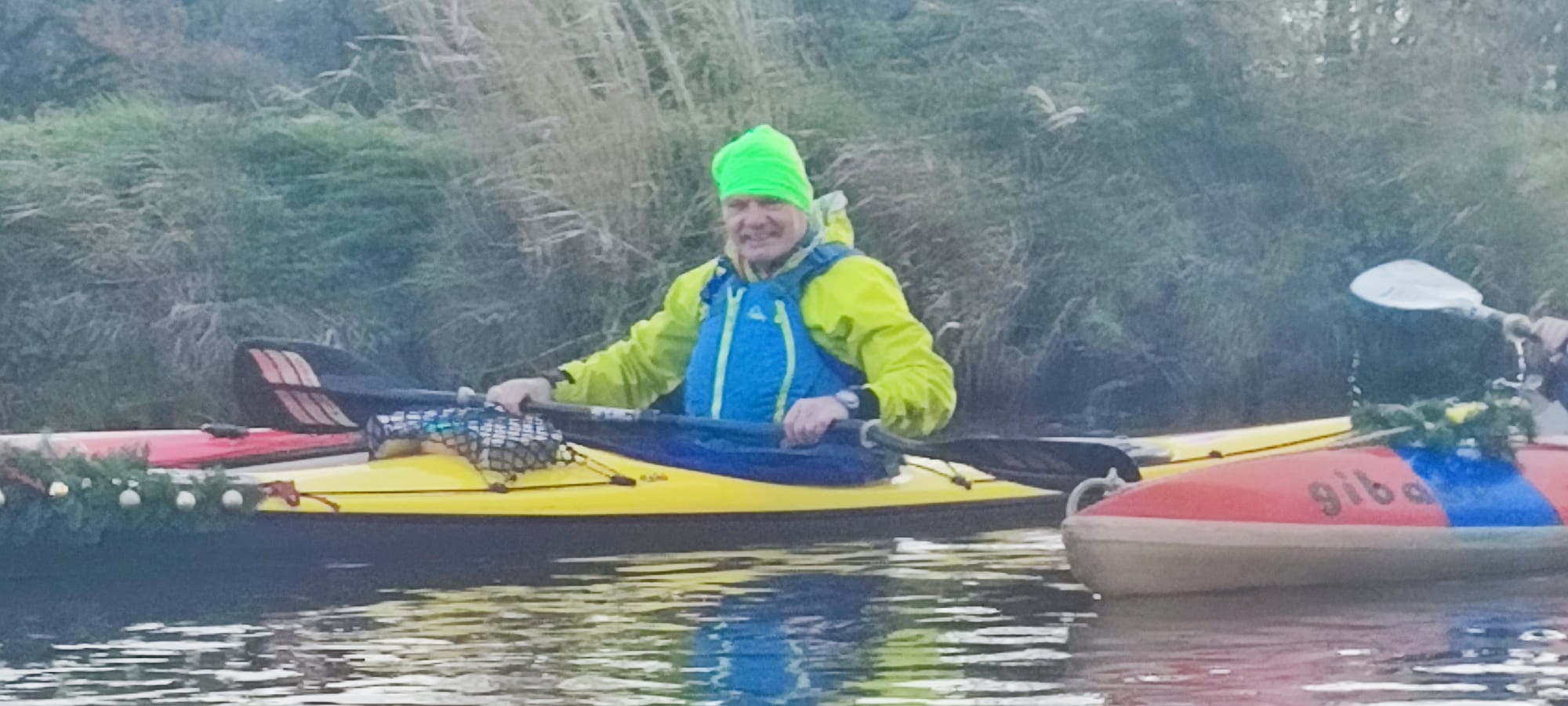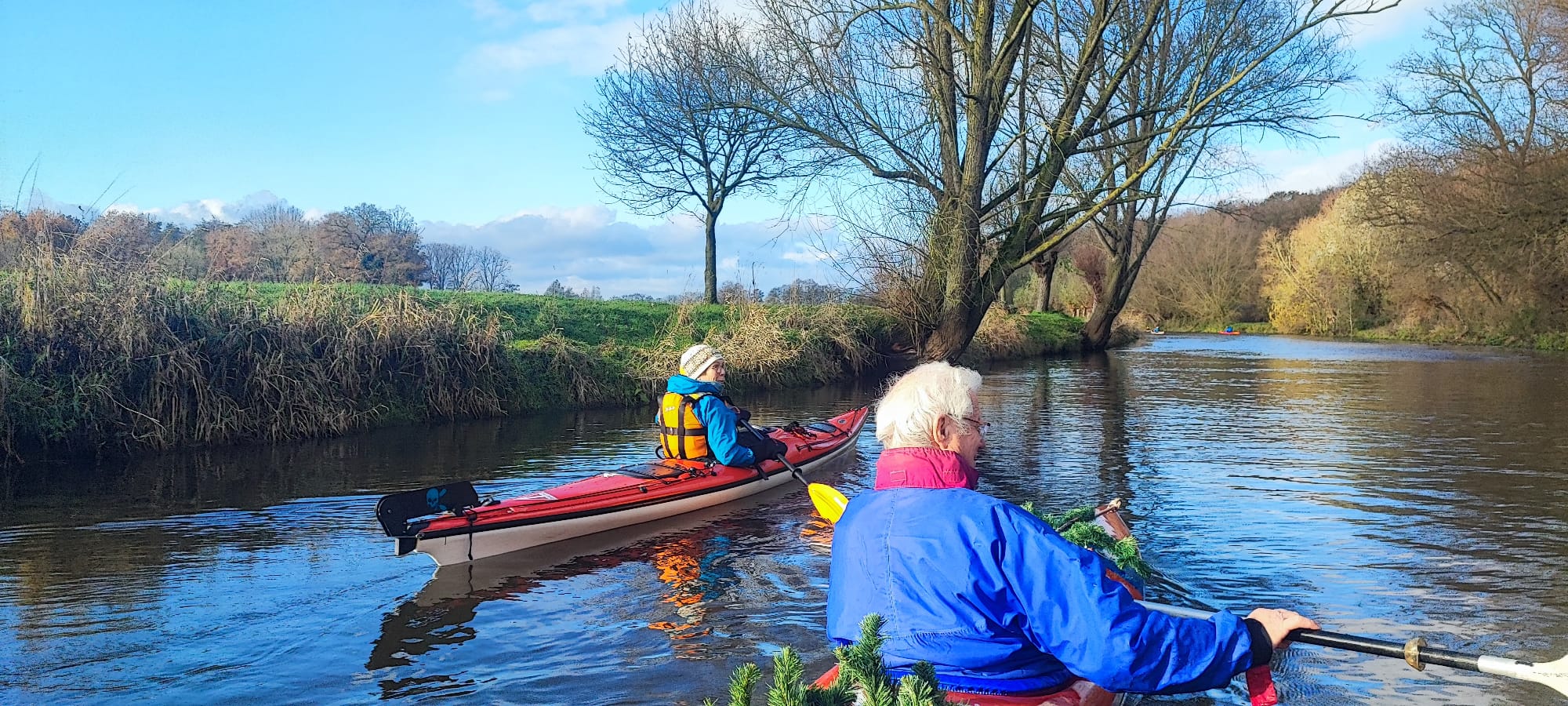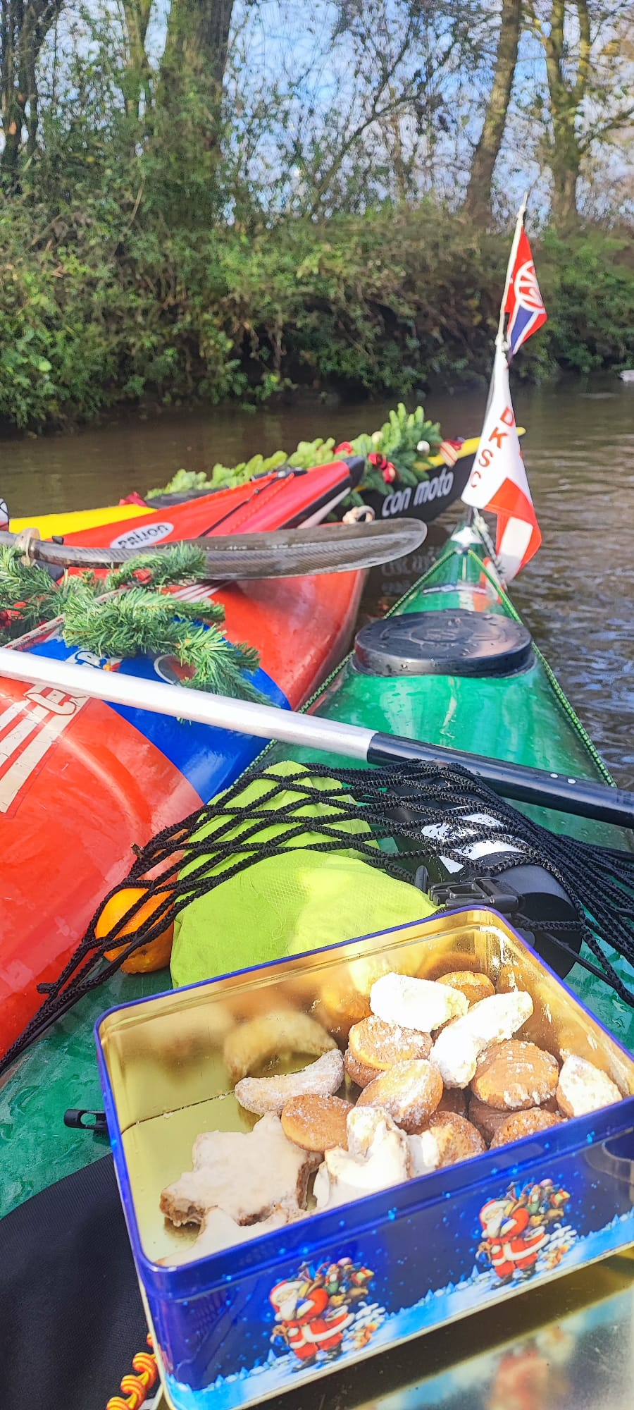 Die Tour führte über die idyllische Niers von Schloss Wissen bis nach Goch – eine beliebte Strecke im Bezirk, die nicht nur landschaftlich überzeugt, sondern auch genug Raum für gemeinsames Genießen lässt. Die Teilnehmenden hatten ihre Kajaks mit Tannenzweigen, Kugeln und kleinen Lichtern weihnachtlich geschmückt. An Bord: Glühwein, selbstgebackene Plätzchen und Mandarinen.